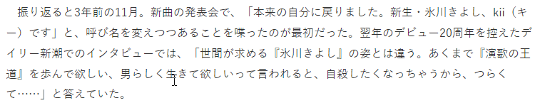 振り返ると3年前の11月。新曲の発表会で、「本来の自分に戻りました。新生・氷川きよし、kii(キー)です」と、呼び名を変えつつあることを喋ったのが最初だった。翌年のデビュー20周年を控えたデイリー新潮でのインタビューでは、「世間が求める『氷川きよし』の姿とは違う。あくまで『演歌の王道』を歩んで欲しい、男らしく生きて欲しいって言われると、自殺したくなっちゃうから、つらくて……」と答えていた。