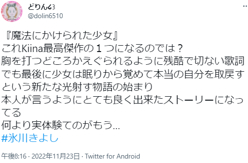 氷川きよし歌手活動最後の曲としてリリースした『魔法にかけられた少女』Kiina名義での作詞が、こみあげるものがある、セツナイと話題です。